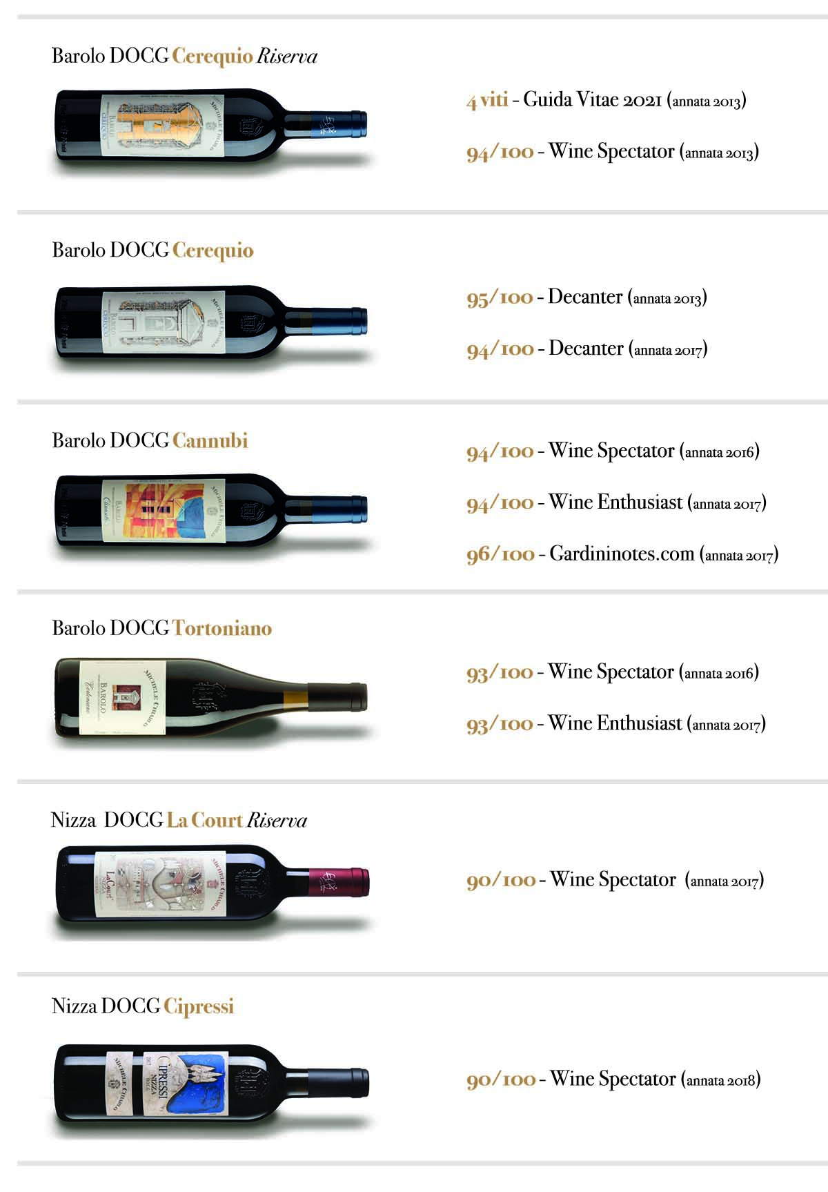 Decanter, Wine Enthusiast, Wine Spectator, Vitae, Luca Gardini, attribuiscono ottimi punteggi alle nostre etichette più iconiche: ai Barolo che provengono da appezzamenti leggendari come Cannubi e Cerequio; ma anche ai Nizza le cui uve sono coltivate in una delle più spettacolari tenute del Monferrato, La Court. I risultati ottenuti riconoscono il nostro impegno nel valorizzare l’espressione più autentica dei grandi vigneti che abbiamo la fortuna di coltivare, secondo la nostra filosofia produttiva: «Experience the best crus in Piemonte».